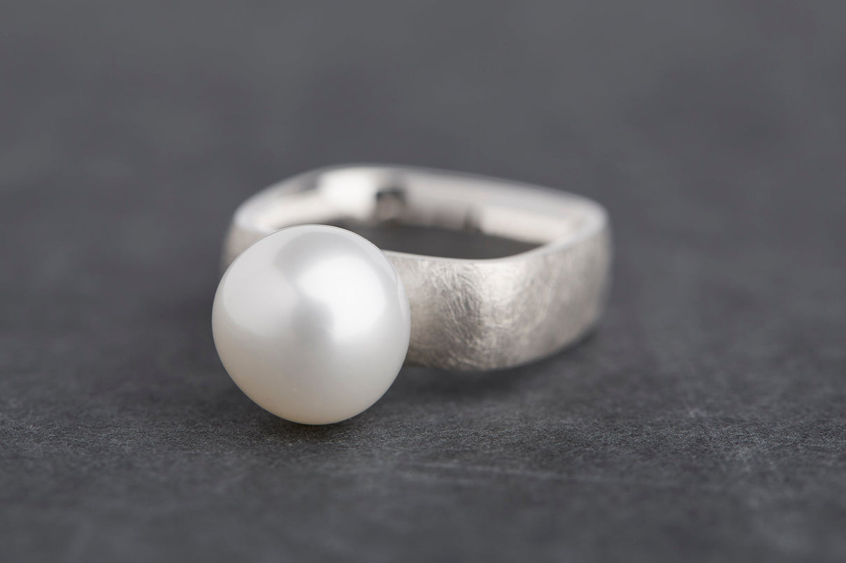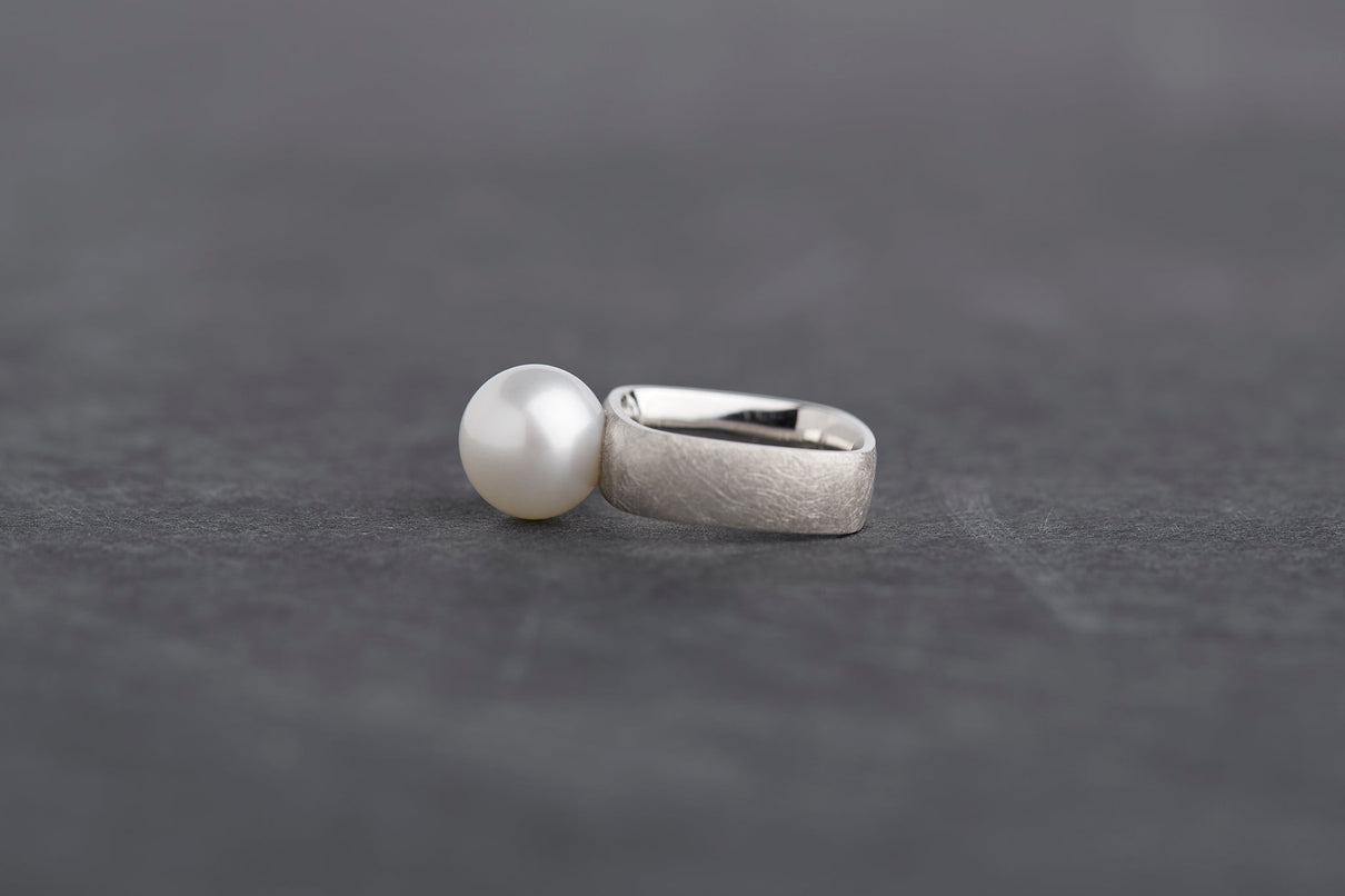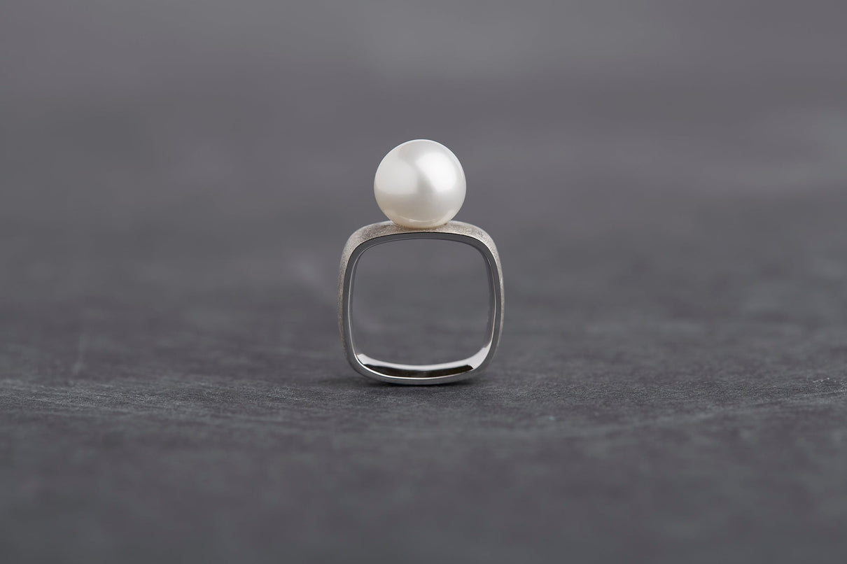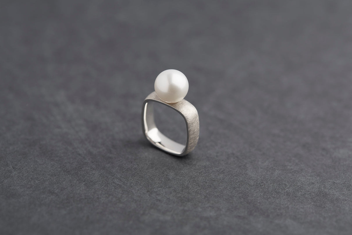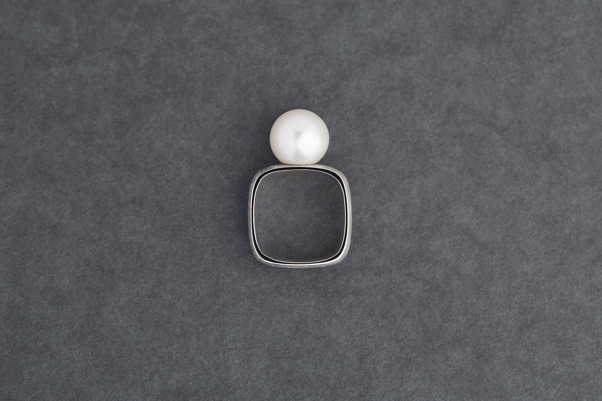 The Syami series is inspired by the body shape of the traditional Japanese instrument, the shamisen. The soft, beautiful square form found in this ancient instrument is thought to naturally fit the slightly oval cross-section of the finger. The interior is smoothly rounded with careful attention to thickness and angles, providing an unexpectedly comfortable fit despite the square exterior. The gentle, organic form and the lustrous freshwater pearl stand out against the matte-textured silver ring, creating a unique piece with a strong presence.
