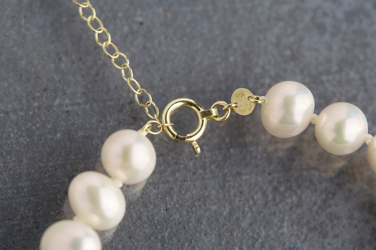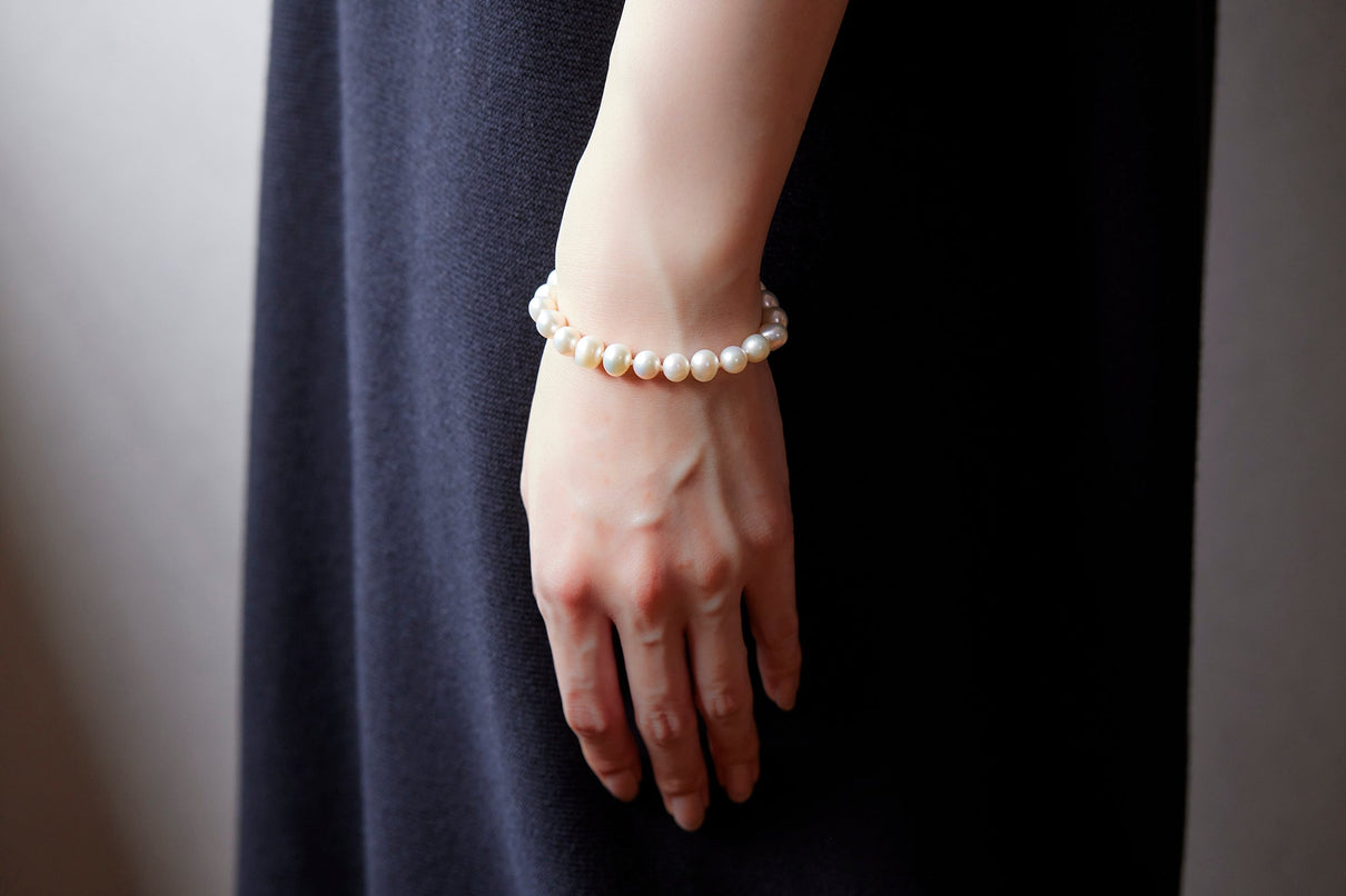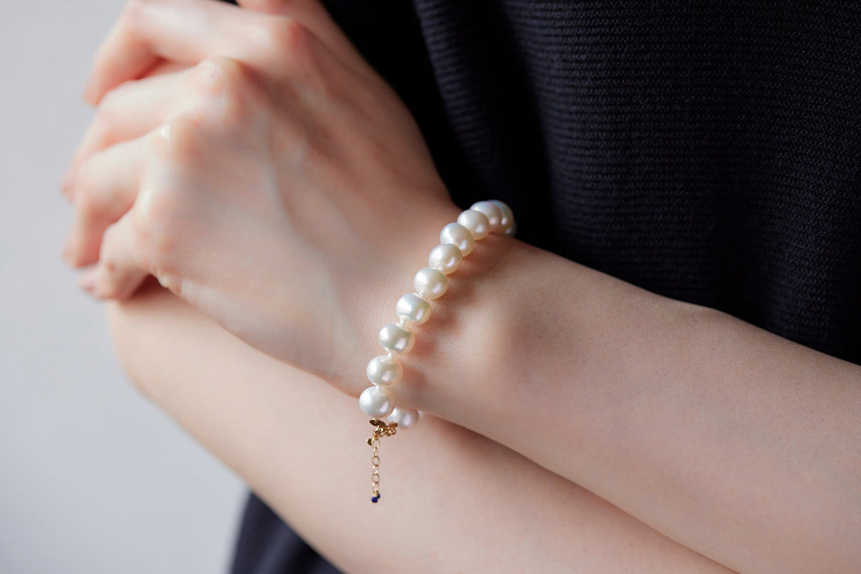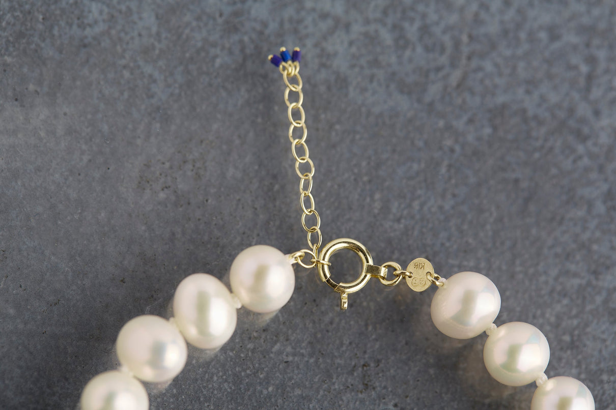 This bracelet is crafted from beautiful white freshwater pearls, celebrated for their high luster and gentle sheen. Each pearl is carefully knotted using the all-knot technique, giving it a very supple and comfortable fit. The bracelet brightens and adds elegance to the wrist, making it perfect for both formal occasions and everyday wear. Three tiny lapis lazuli stones dangle from the end of the adjustable chain, providing a subtle accent that catches the light within the bracelet's simple design.