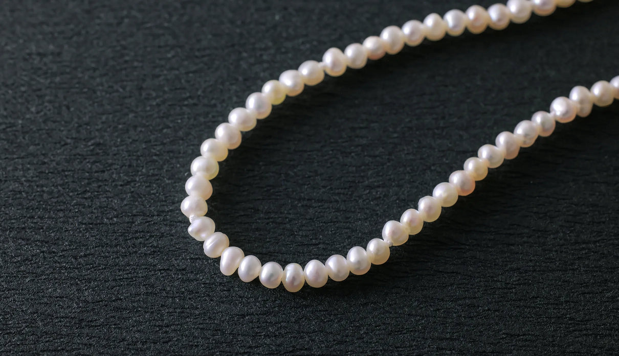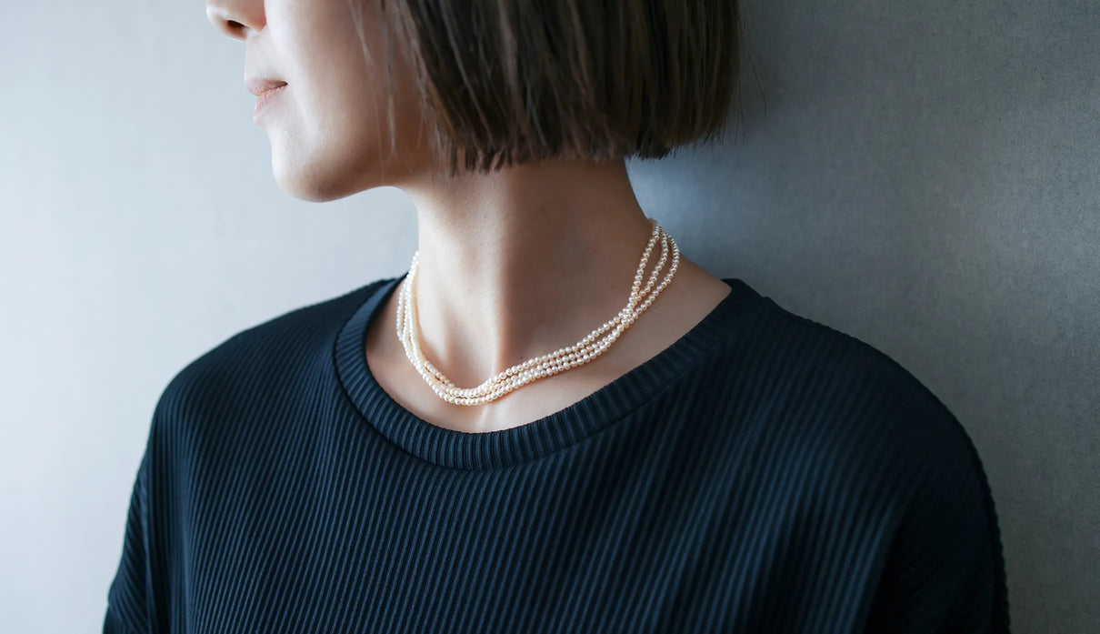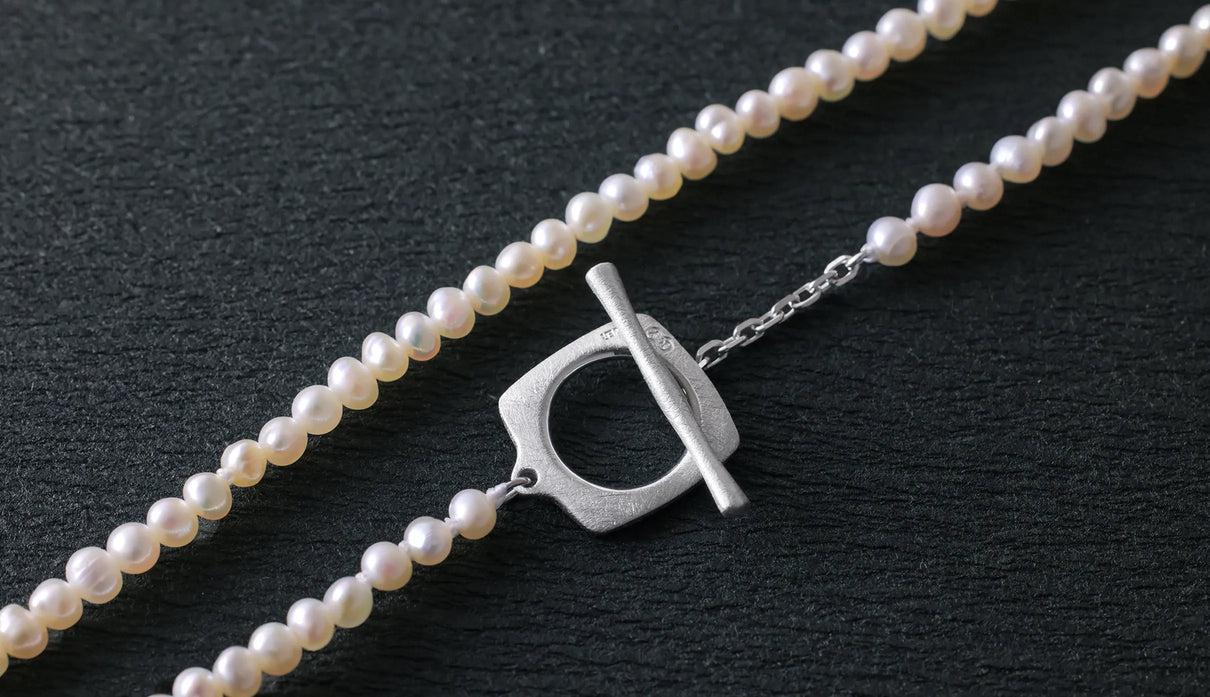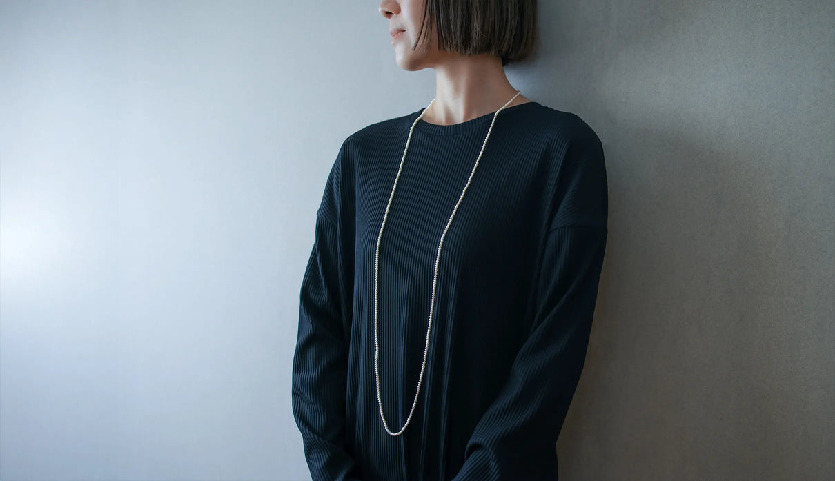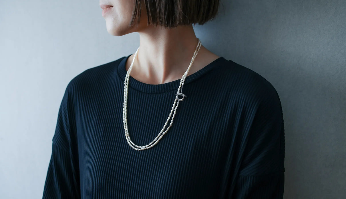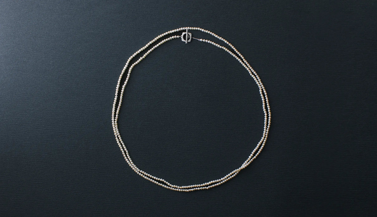 A 120cm long necklace strung with small white pearls. Each rare baby pearl has a graceful, organic form and a soft luster. Worn as a single long line flowing gently over the chest, doubled for a light, voluminous style, or tripled to create a short necklace with an elegant presence around the neckline. The length allows for three distinct looks. The clasp features Ryui's original silver mantelle, which can be displayed as a subtle accent or positioned at the back, maintaining a beautiful balance. A pearl necklace with a gentle presence that quietly complements both everyday wear and special occasions.