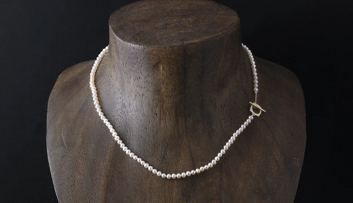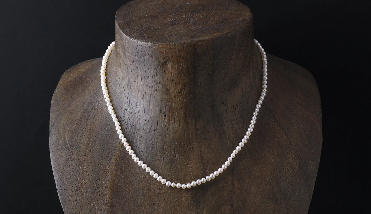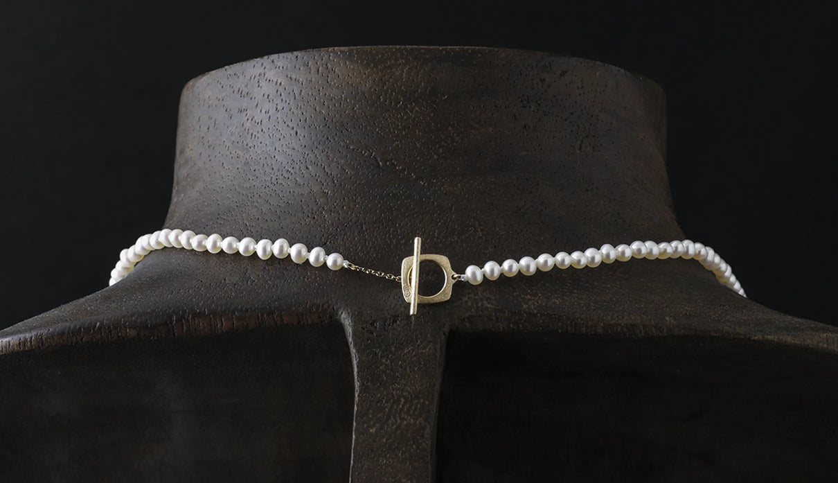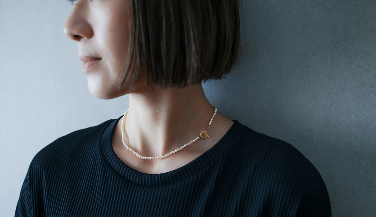 A necklace strung with uniformly sized white baby pearls. Though small, each pearl has a clear, lustrous shine, bringing a sense of purity to the neckline. Baby pearls of such consistent beauty are exceptionally rare. The clasp is a petite Ryui original mantelle in K18 yellow gold, which can be shown at the front as a subtle accent or positioned at the back for a quietly elegant look, allowing you to change the style to suit your mood. This pearl necklace exudes a gentle presence that complements both everyday wear and special occasions.