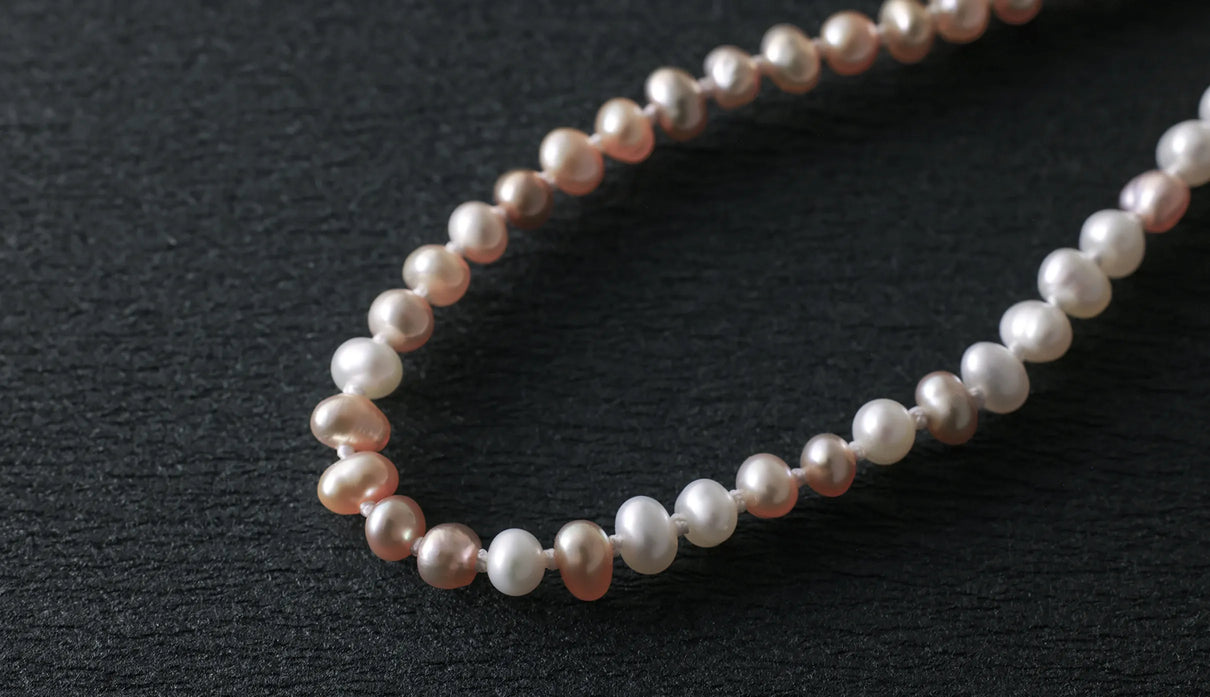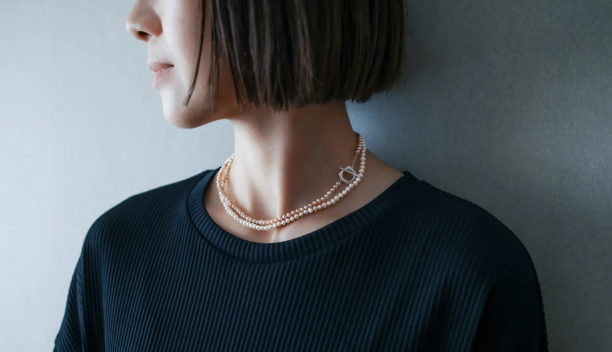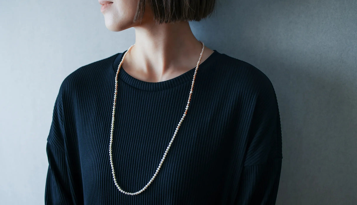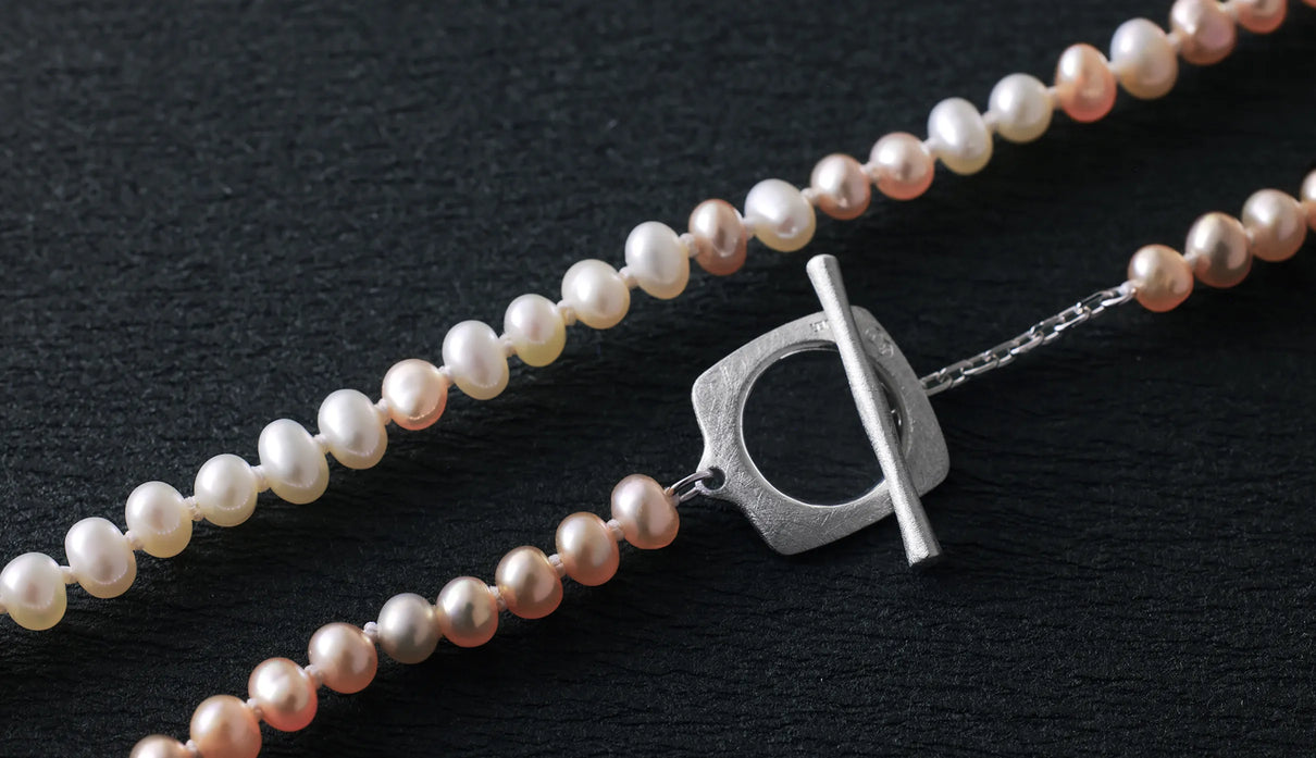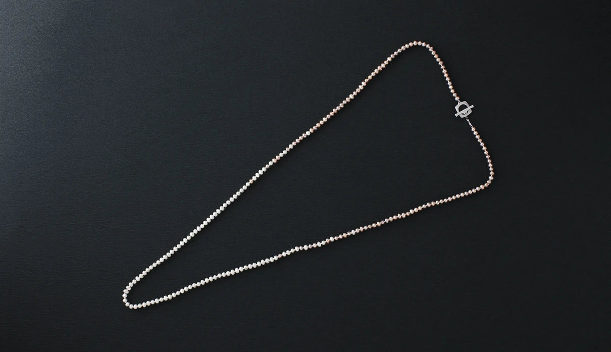 An 80 cm long necklace strung with small white and pink pearls. The subtle blending of colors creates a gentle gradient effect, with soft whites and delicate pinks mingling to cast a tender glow on the skin. Worn as a single strand, it leaves a natural sense of space, or doubled to add a subtle layered effect, bringing refined nuance to any outfit. The clasp is a Ryui original silver mantelle, which can be shown at the front for a delicate accent or positioned at the back for a quiet elegance, allowing you to adapt the style to your mood. This pearl necklace carries a soft sense of playfulness within its understated sophistication.